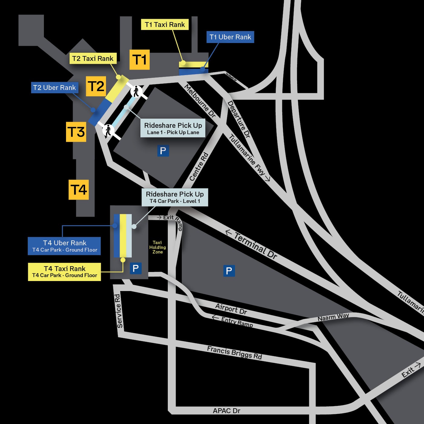 You can pre-book a taxi to pick you up from the airport. Pick-up will be at the north end of the Terminal 1, 2 & 3 Car Park (closest to Terminal 1). A Melbourne Airport access fee of $4.78 (inc GST) applies to all pick-ups from an airport taxi rank. The fee is included in the taxi fare, and there is no airport charge for drop-off.